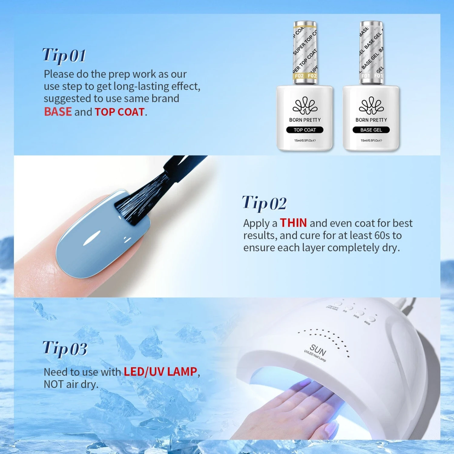 Step 3. Apply BORN PRETTY Base gel first,which can make polish lasting longer, cure with UV lamp or LED lamp. (Necessary)