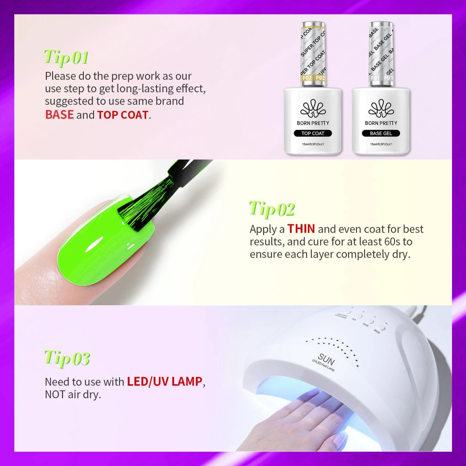 Step 3. Apply BORN PRETTY base gel first,which can make polish lasting longer, cure with UV lamp or LED lamp. (Necessary)