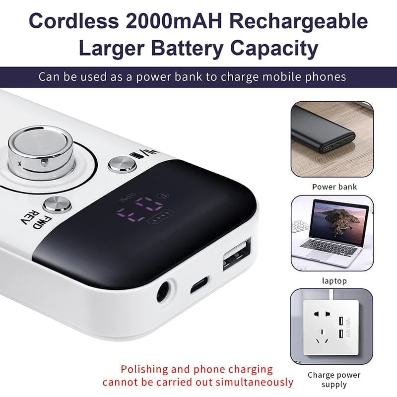 【 Maximum speed 45000RPM】: The rechargeable nail drill matched with a mobile power supply can work for up to 10 hours after being fully charged for 2 hours.